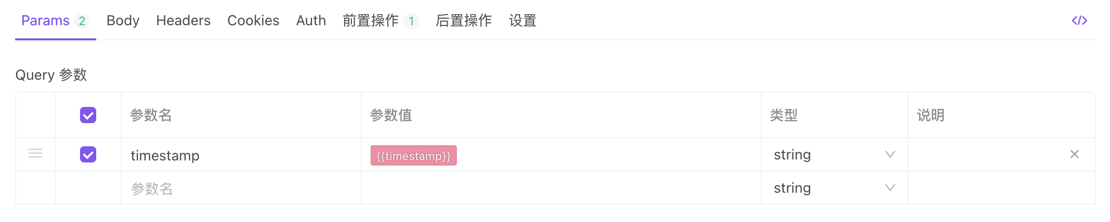 将参数 timestamp 的值设置为 {{timestamp}} 。当请求发送时,前置脚本将被执行,环境变量 timestamp 的值会被设置为当前时间戳,同时 {{timestamp}}也会被替换为当前时间戳。