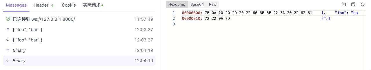 • 如果消息是二进制格式,默认会显示消息的 Hexdump,也可以查看经过 Base64 编码后的消息和原始消息。
